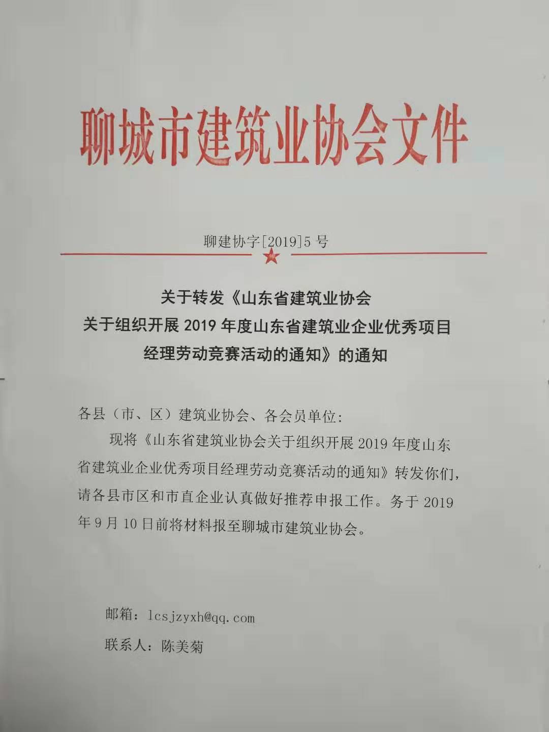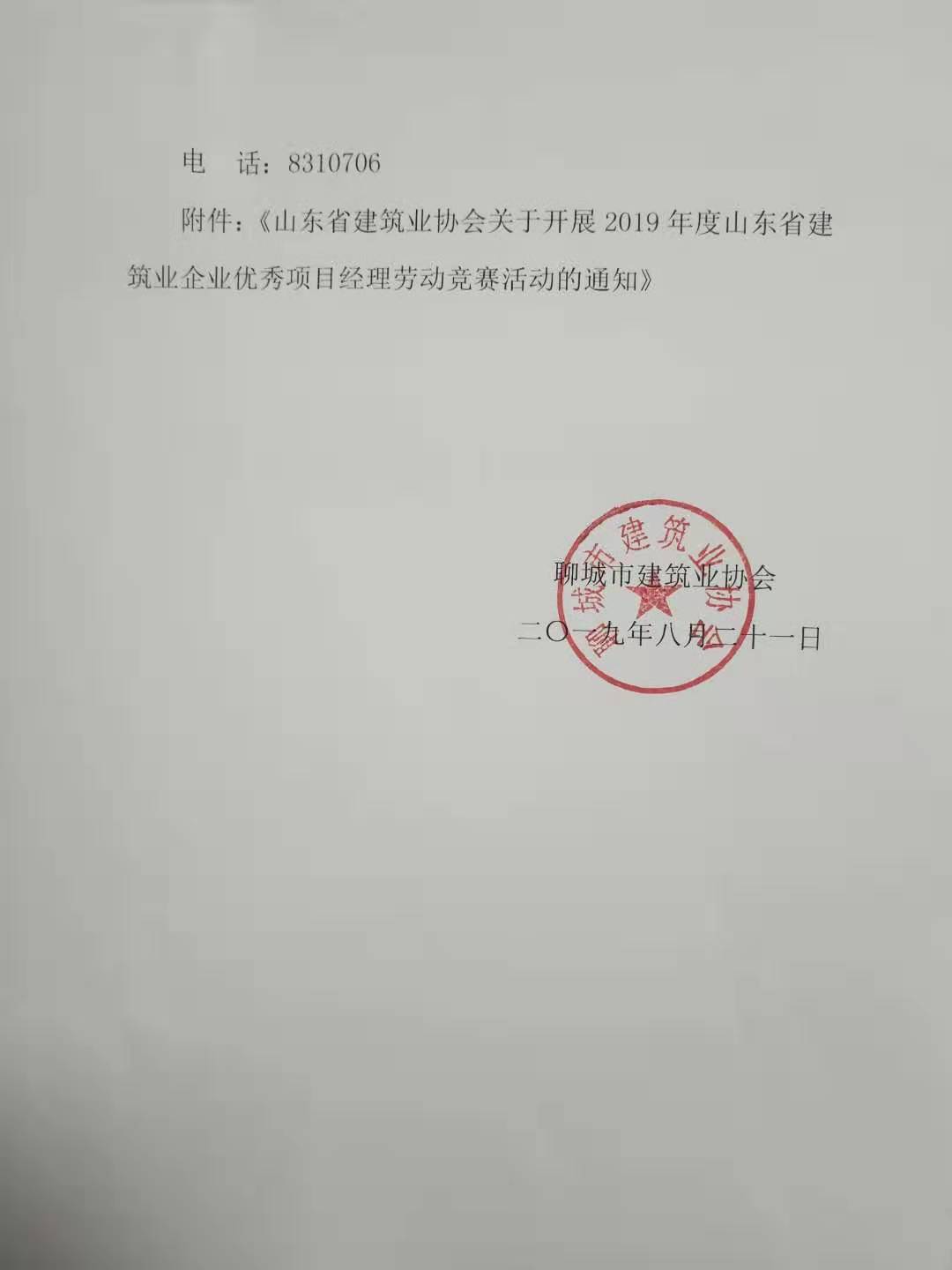 關(guān)于轉(zhuǎn)發(fā)《山東省建筑業(yè)協(xié)會(huì) 關(guān)于組織開(kāi)展 2019 年度山東省建筑業(yè)企業(yè)優(yōu)秀項(xiàng)目 經(jīng)理勞動(dòng)競(jìng)賽活動(dòng)的通知》的通知