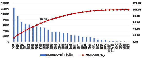 2019 年上半年,江蘇、浙江兩省依然領跑全國各地區(qū)建筑業(yè),建筑業(yè)總產值分別達到 12438.98 億元、9291.17億元,兩省共占全國建筑業(yè)總產值的 21.38%。除江蘇、浙江兩省外,總產值超過 5000 億元的還有湖北、廣東、四川、山東、福建、北京和河南7 個地區(qū),上述 9省市完成的建筑業(yè)總產值占全國建筑業(yè)總產值的 62.53%(圖 1)。