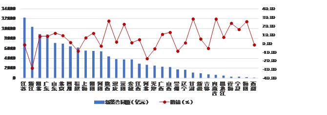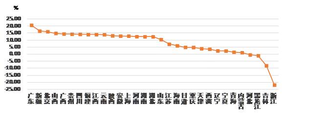 從各地區(qū)建筑業(yè)總產值增長情況看,有 27 個地區(qū)的建筑業(yè)總產值較上年同期有不同幅度的增長。其中,廣東、新疆、北京的增幅均超過 15%。有 4個地區(qū)出現(xiàn)負增長,其中,浙江出現(xiàn)了 超過20% 的負增長(圖 2)。